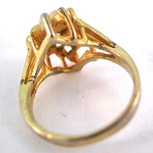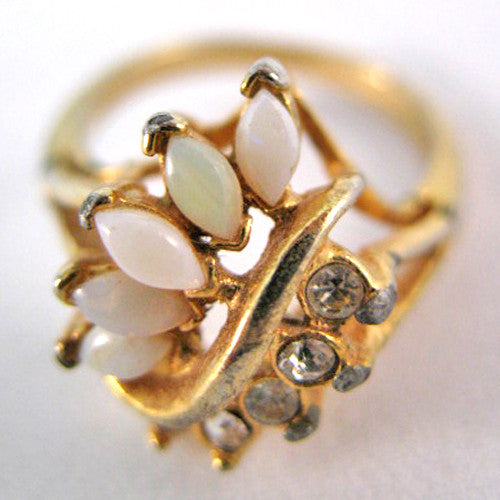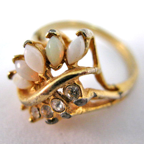 VINTAGE gold tone womens rings, CLUSTER RING with five (5) WHITE OPAL gemstones and five (5) crystal / glass stones elevated deco accent. This is in good condition, pre-owned, has signs of wear in the gold tone band, plenty of life left, all stones are intact. There is a marked / signed U symbol with an arrow across it, it also has a number 7 marked. Its unknown what type of metal, tested with magnet, ring wont stick to magnet. This ring is a size 7. Seller code use only: RING009