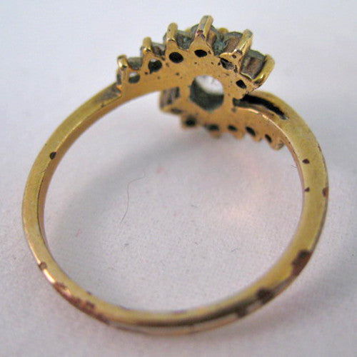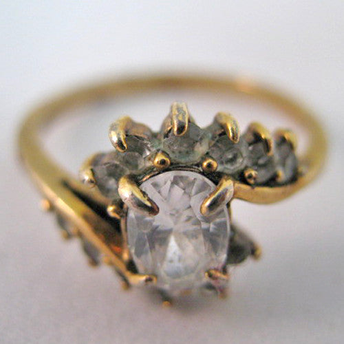 VINTAGE Crystal Clear Glass SOLITAIRE STONE with 12 small glass stones accent. In good condition, pre-owned, the band has some chipping of coating/plating mostly at the inner side, sold as is, the stones are individually set are in great condition, all intact. The clear stones both main stone and accent stones are clear, unknown what type of stone, sold as is. There are no markings in the ring, type of metal is unknown. Ring is a size 7. Code for seller use only: RING028
