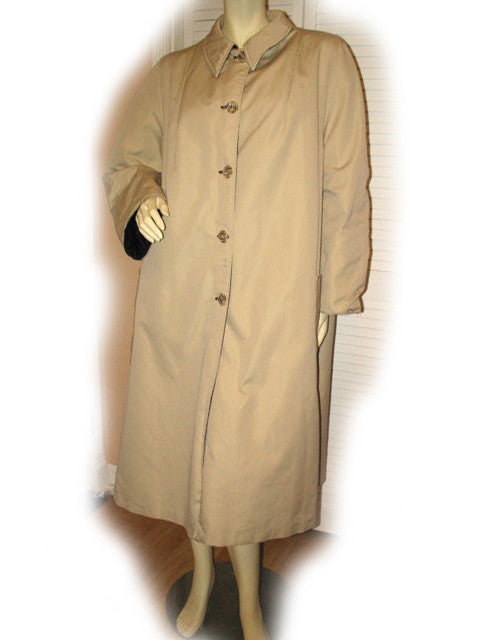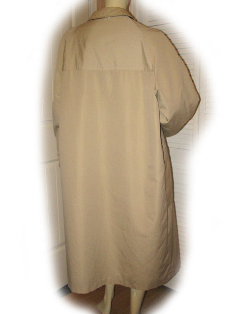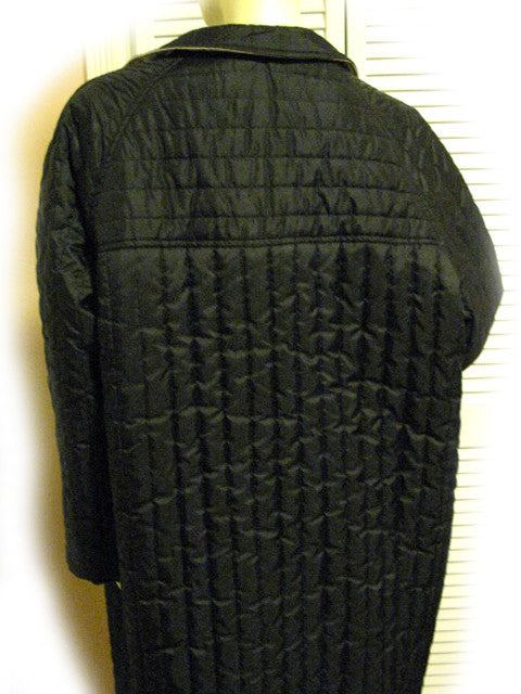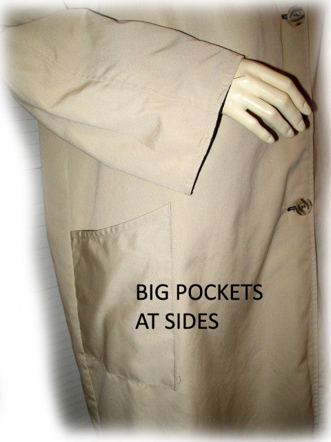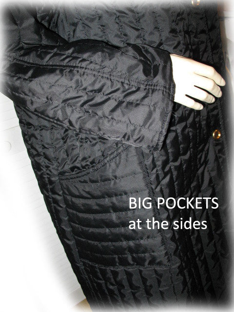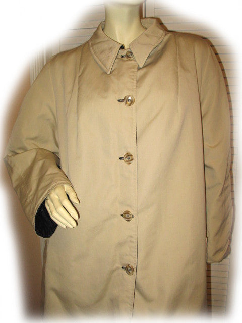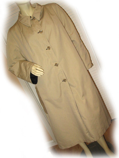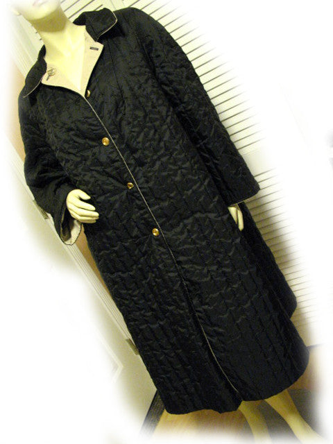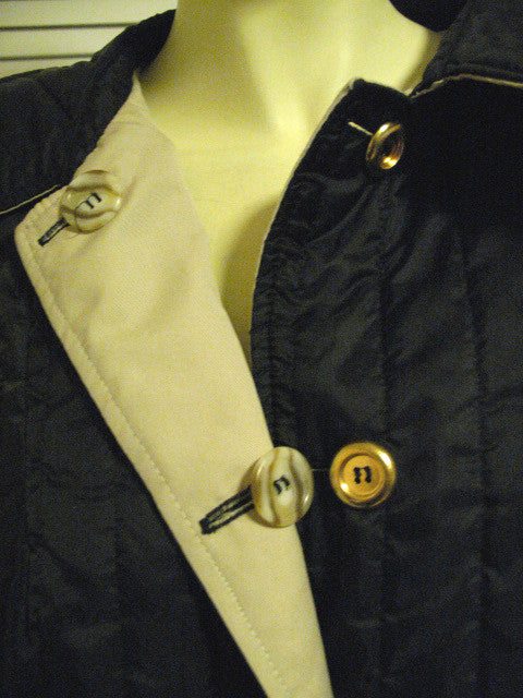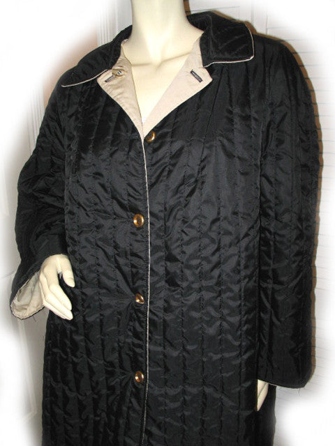 Womens Long Trench Coat. It is a reversible winter jacket, one side is black quilted, the other side is beige/tan /khaki. Both sides have two big pockets, total of 4 big pockets. In great condition, preowned. Material is UNKNOWN, no tag attached. Womens coats / ladies coats great for winter or fall season outerwear, etc. Hurry! We only have ONE PIECE of this item!
